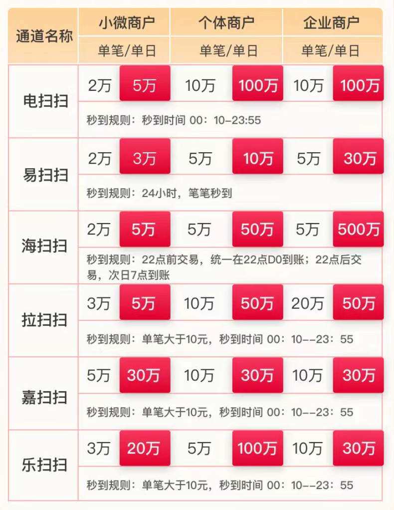 (1)海扫扫: 小微单笔2万,执照单笔5万, 0.36%, 秒到费➕万2,到账规则见《参考注册时注意事项》